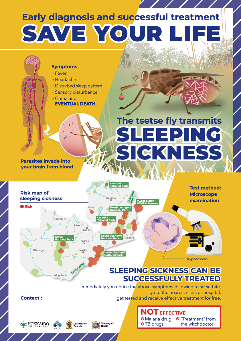 北海道大学の人獣共通感染症リサーチセンターの山岸潤也先生と林田京子先生からのご依頼で、ザンビアの人たちに「眠り病ではないか」と早めに疑ってもらえるように、病気のしくみをわかりやすく伝えるデザインにしました。