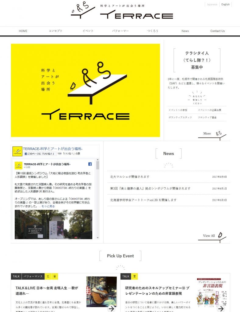 北海道大学様で、サイエンスとアートの関係を問うプロジェクト「TERRACE(テラス)」が2016年にスタートし、年間を通して開催されるイベントと、それに関わる研究者とアーティストを紹介するウェブサイトを担当いたしました。また、TERRACEに関わりたい人たちや連携したい機関やプロジェクトを募り発展していくことで、プロジェクト全体が変化していくことを予想して、ウェブサイトも柔軟に改変できるようにしました。