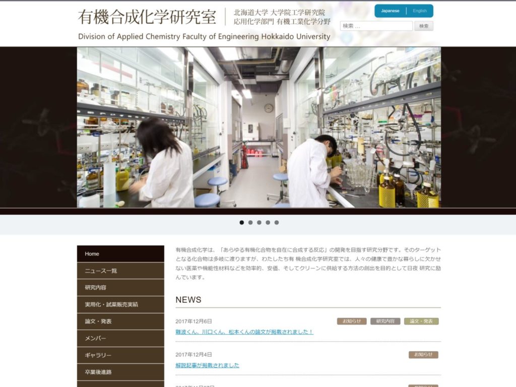 そこで、実験室の大きな写真をトップページに表示させ、明るく、快適な研究室の様子を伝えています。また、投稿記事のNEWSでは、先生および学生の皆さんの研究成果や研究室イベントの様子をコンスタントに紹介されています。先生のご希望で、研究室のイベントごとの写真を掲載するギャラリーのページを作成しました。