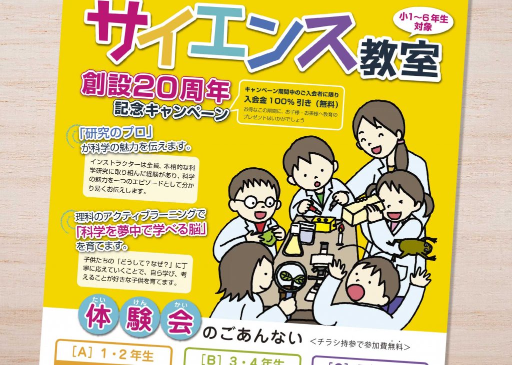 科学の楽しさを子供たちに伝えていらっしゃるサイエンス教室様の体験会フライヤーです。子どもたちとその保護者のみなさんにひと目で興味を持っていただけるように、かわいいイラストと元気な色づかいで制作しました。