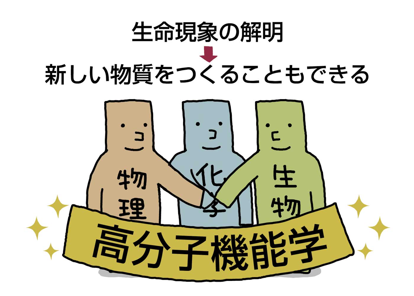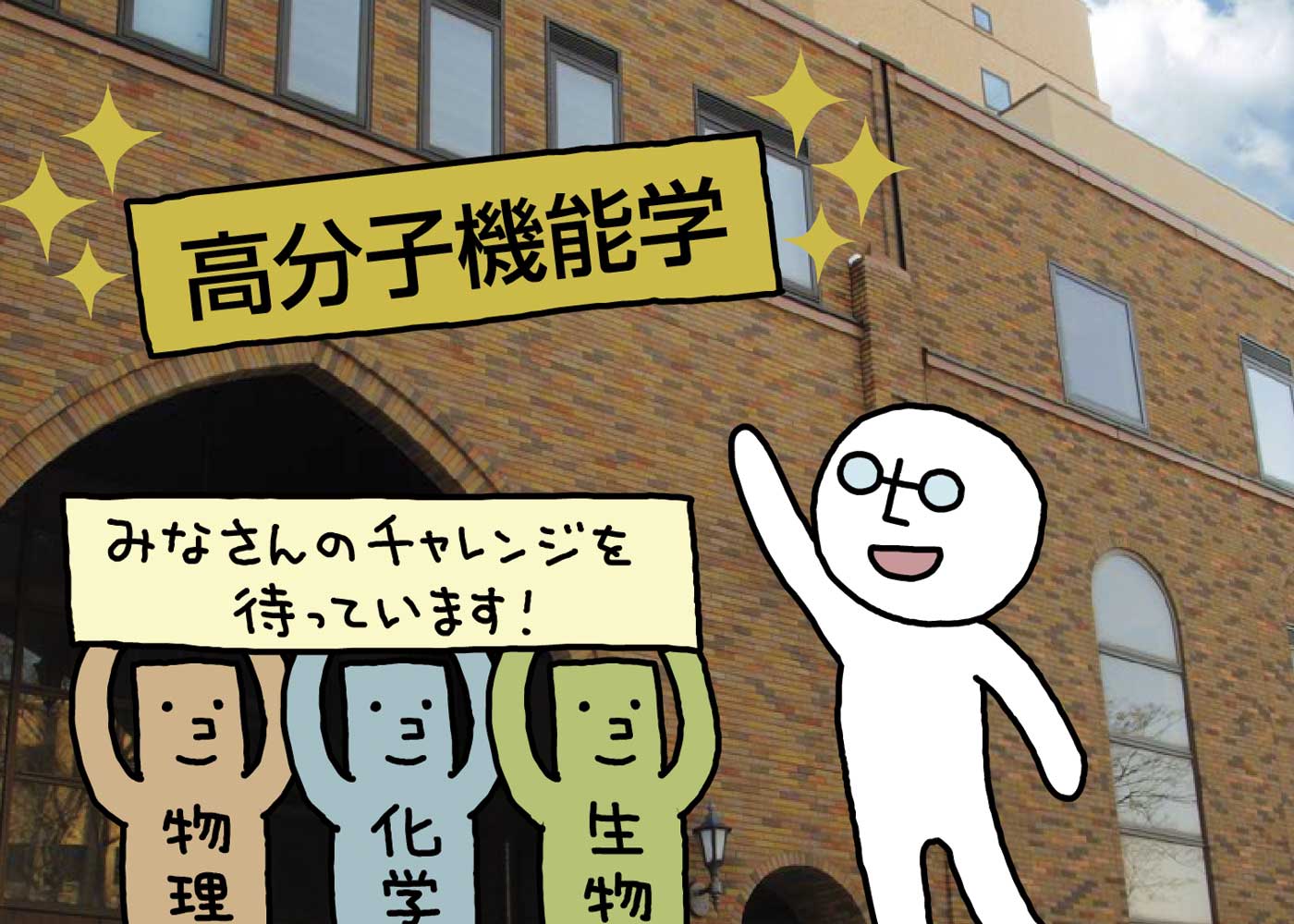 高校生や大学1年生のみなさんにとって耳慣れない「高分子機能学」について興味を持ってもらうために、アニメーションの3分動画を制作しました。長い時間の動画は最後まで見てもらうことが難しいため時間を3分と決め、途中で退屈しないようにコミカルなキャラクターがテンポよく解説するようにしました。学科説明会や大学祭イベントなどでも上映して活用していただいています。