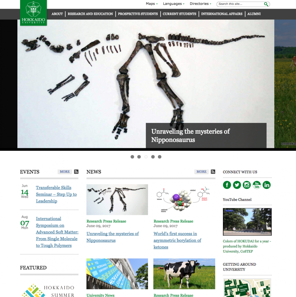 例えば、海外から初めて北海道を訪れる人たちに、事前に札幌、函館キャンパスと街の様子を伝える「DISCOVER HOKKAIDO UNIVERSITY」。留学生がキャンパスに迷わず、施設を活用できるように作成したキャンパスマップはGoogle MapsのAPIを使った高機能なものです。北大の歴史を貴重な写真で紹介する「DISCOVER OUR HISTORY」など、スペシャルなコンテンツや機能も制作しました。