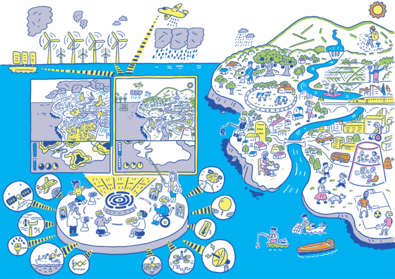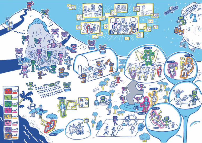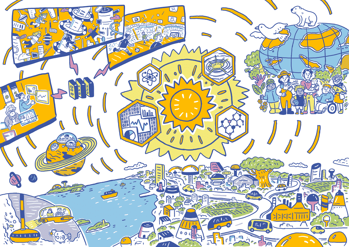 実際に研究者に取材いただき、研究開発の内容を踏まえて2050年の人々の生活や社会をイラストに仕上げていただきました。