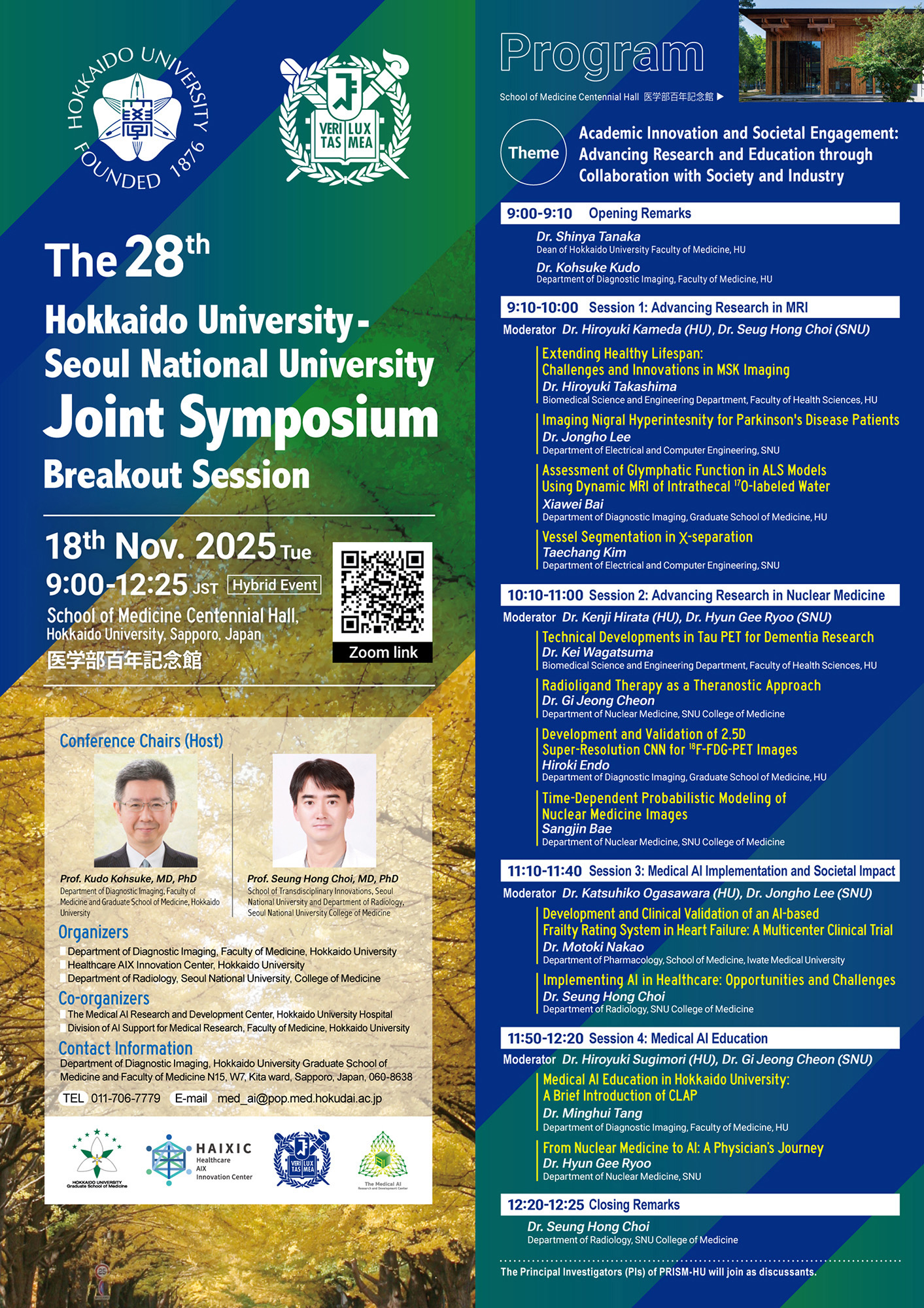 北海道大学(HU)と ソウル大学校(SNU)との学術交流事業の一環として開催された「第28回 Hokkaido University-Seoul National University Joint Symposium Breakout Session」(ハイブリッド開催)において、配信業務およびポスター制作をご依頼いただきました。